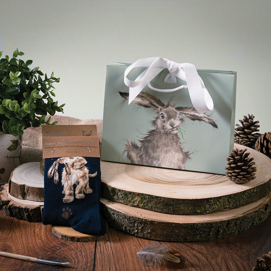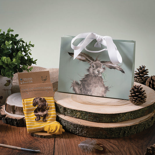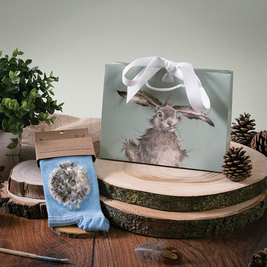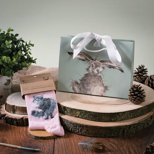 Each pair of socks comes with a gift bag (rope handle & grosgrain ribbon) that features the Hare Raising design. Christmas socks come with a gift bag featuring Robins- Snuggled Together which has a rope handle and a bright red, grosgrain ribbon.