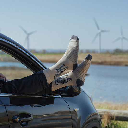 Wrendale Designs gift socks are made from bamboo and are very soft and breathable. The design is stitched onto the sock with nylon thread making it quite robust. The illustration appears on the outer & inner side of each sock. There are quite a few of Hannah Dale's designs on various background colours, from which to choose.
